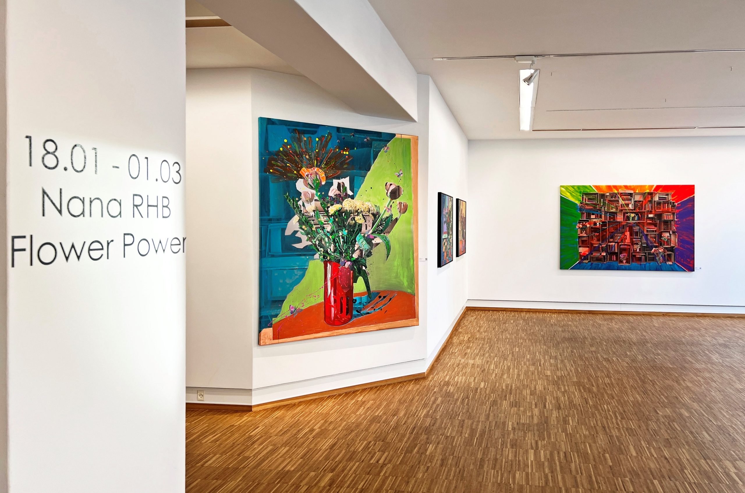 I udstillingen Flower Power præsenterer Galleri NB en serie værker af Nana RHB, hvor papkasser og blomsterbuketter smelter sammen i en spændingsfyldt dialog mellem kaos og harmoni. I de udstillede Overpaintings bearbejder og overmaler Nana RHB fotografier af papinstallationer og blomsterarrangementer, trykt på sejldug. Resultatet giver yderst interessante og samtidig smukke dynamikker i oplevelserne mellem installation og maleri.